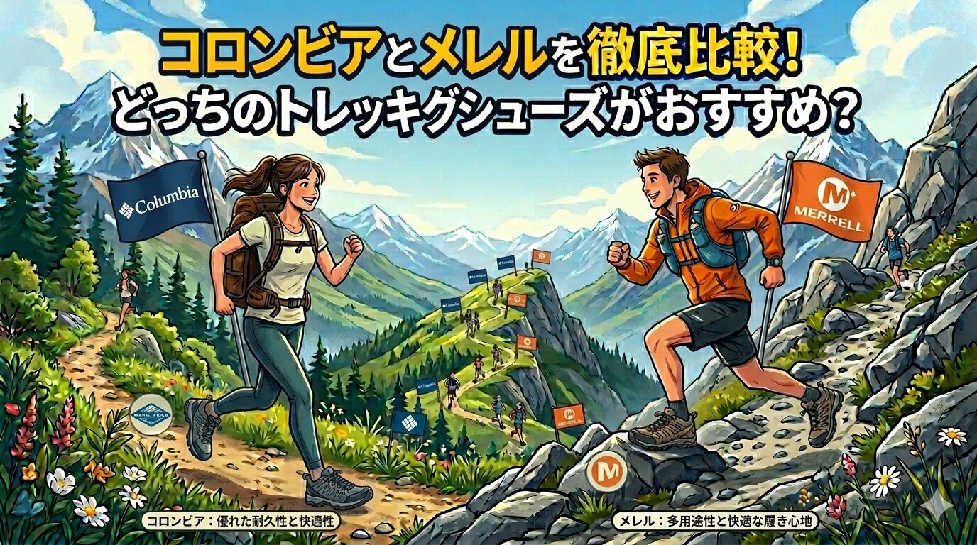 フィット感やグリップ力、防水透湿性、長時間歩行の快適性を重視するならメレルが選びやすく、登山道をしっかり歩きたい人に向いています。価格や軽快さ、街でも合わせやすい見た目を重視するならコロンビアが有力です。使う場面に合わせて選ぶと失敗しにくい比較です。