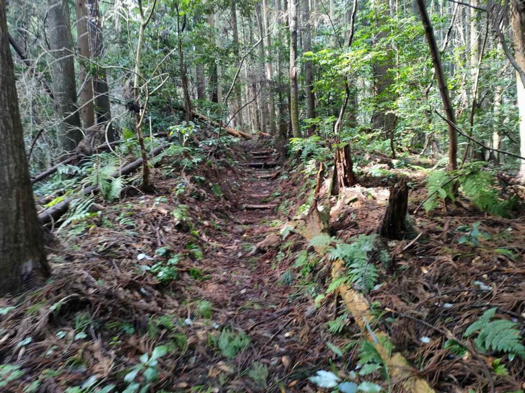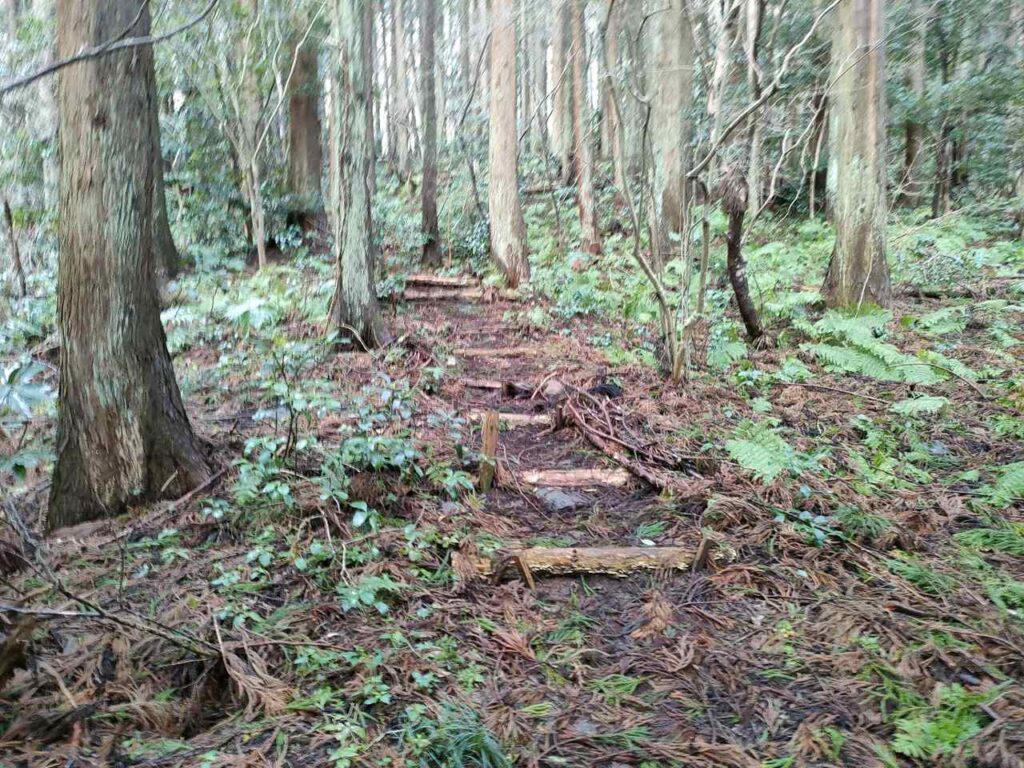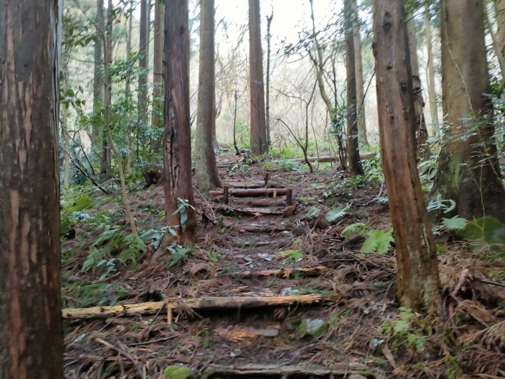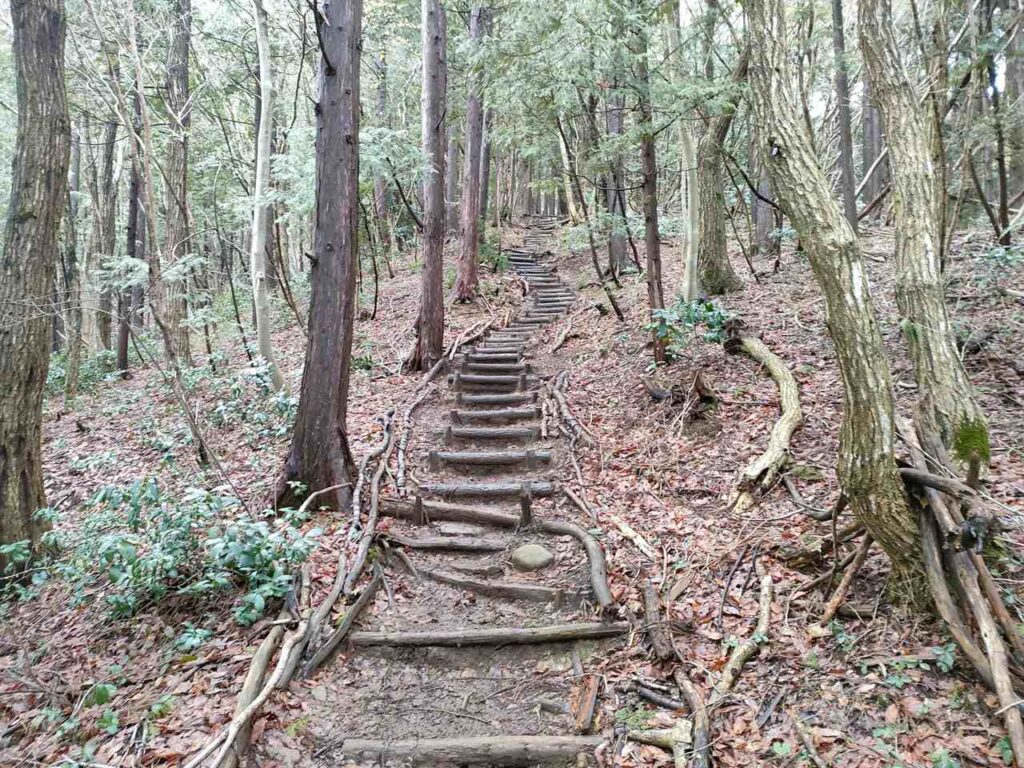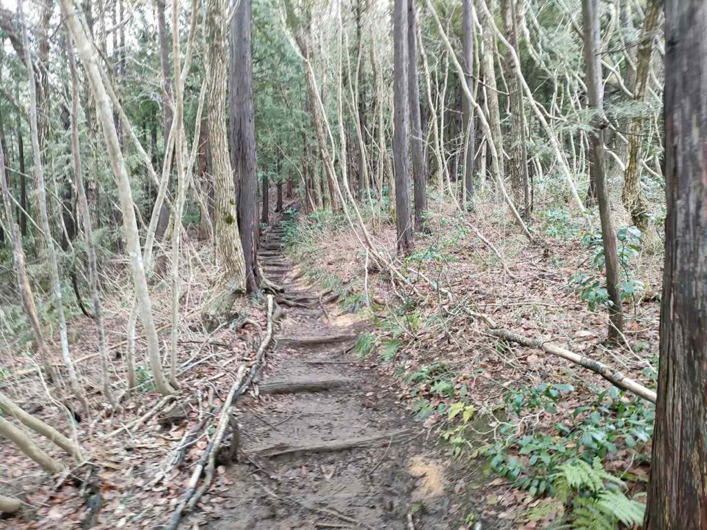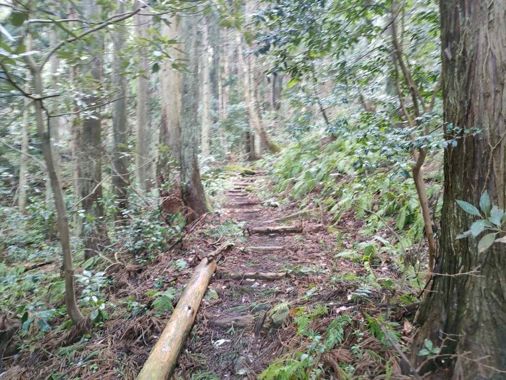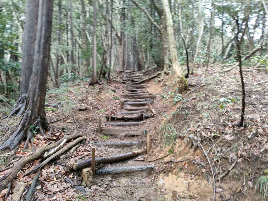 合流までは地面はふかふかしているので、歩き心地はいいです。しかし、合流前にも急階段があるので、結構体力が必要です。しかし、景色はいいわけではないので、景色を楽しみたい人には向いていません。